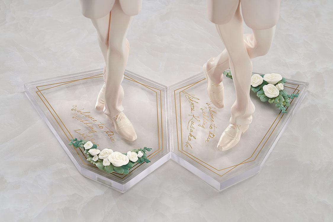 全体には上品なパール塗装を贅沢に施し、控えめながらも内側からにじみ出るような華やかさを演出。台座には草壁光の名前と結婚式の招待文が金色で刻まれ、純白のバラが添えられた繊細な仕上がりは、フィギュア全体のロマンチックな雰囲気をさらに引き立てています。