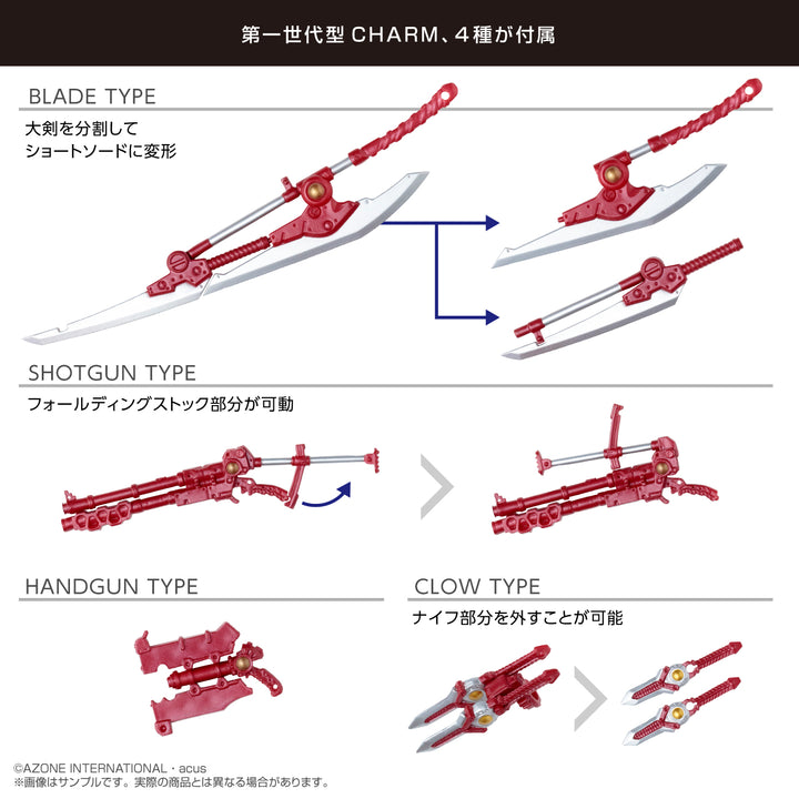 【付属品】第一世代型CHARM(赤)4種(ABS製)、アーマーパーツ(プラキット)、フェイスパーツ4種、ハンドパーツ5種※本体分含む