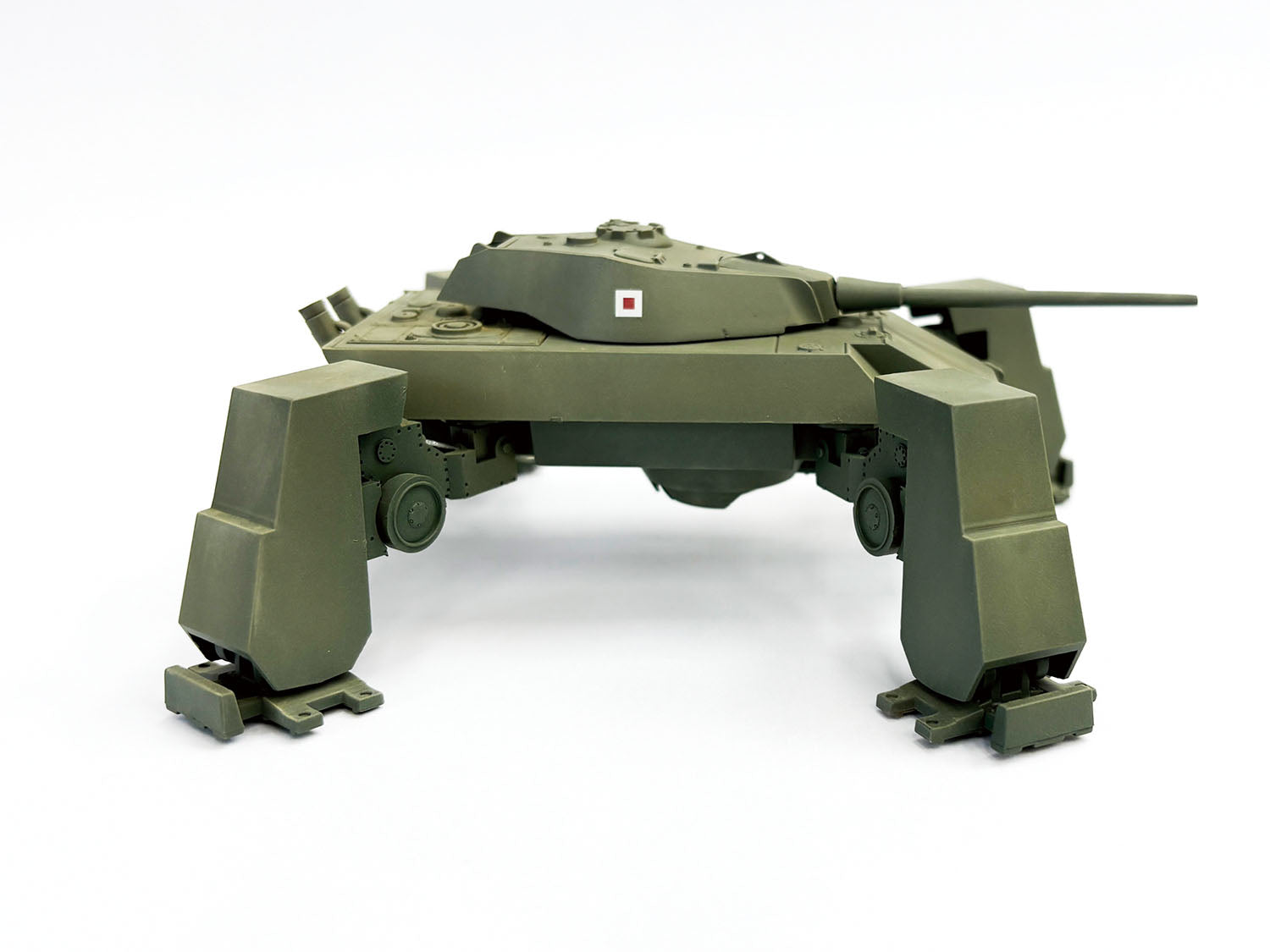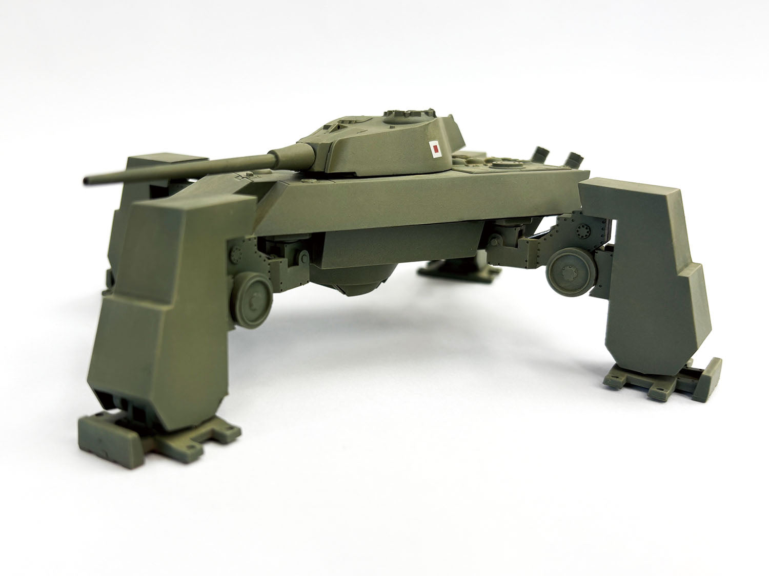 車体上部は12.8cm戦車砲を装備した威牙砲塔を搭載し、車体下部には3糎2連機関砲塔を装備。4脚の機構のメカニズムや車体の形状も正確に表現。脚は固定が推奨ですが組み立て方で部分的に可動させることもできます。加えて、車体前部の赤外線暗視観測装置及び車体前面のライトもセット。選んで取り付けることも可能です。カラーリングやマーキングに想像を膨らませて遊んでみるのも良いでしょう。-