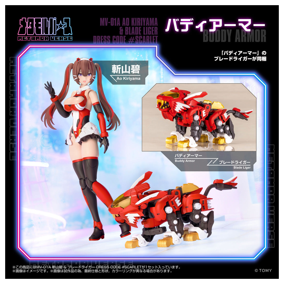 1/10スケールのキャラクター可動プラモデル。プリティアーマーモード(素体)斬山碧とバディアーマー(ディフォルメロボ)ブレードライガーのセットが赤を基調としたカラーリングで登場。