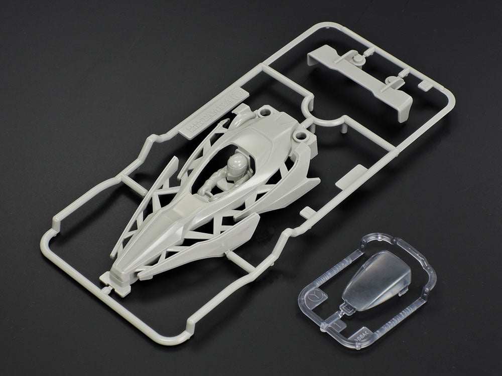 ミニ四駆『レイスピアー』の名前を引き継ぐこのマシンは、車体左右のサイドパネルをセンター部分から離してトラス構造で支えるユニークな形と、スピアー(槍)のような鋭いフォルムが注目です。
